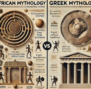 African mythology and Greek mythology compared through function, worldview, and civilisational purpose, examining how myth organised power, ethics, time, and consequence..